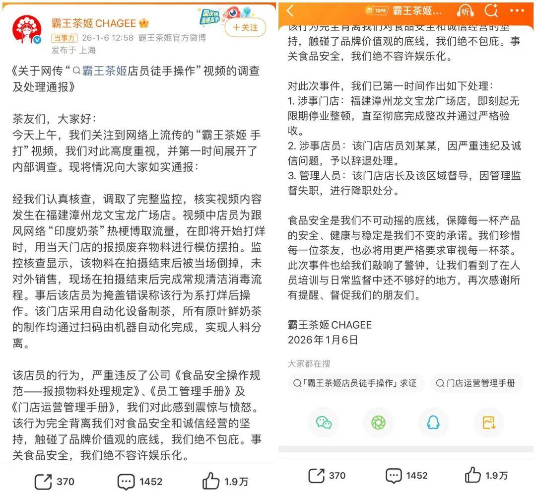 昨日,霸王茶姬、瑞幸等品牌不测“同框”热搜,起因是一则伙计仿照“印度陌头徒手制做饮品”的短视频刷屏社媒。虽然品牌第一时间回应“伙计正在玩梗”,并对涉事门店做出“闭店整理”等庄重处置,但一些消费质疑却仍正在发散。面临舆情,视频发布者很快做出,暗示该内容为处置报废材料时的“玩梗”行为,不涉及现实发卖产物,且视频已标注文娱标签。目前,该网友账号已设为私密。随后,确认该事务系员工利用报废料料仿照“印度奶茶”热梗进行摆拍,公司已对涉事门店做出“破产整理”的决定,并对相关义务人员予以辞退、降职等庄重处置。传递中强调:食物安满是不成的底线。
